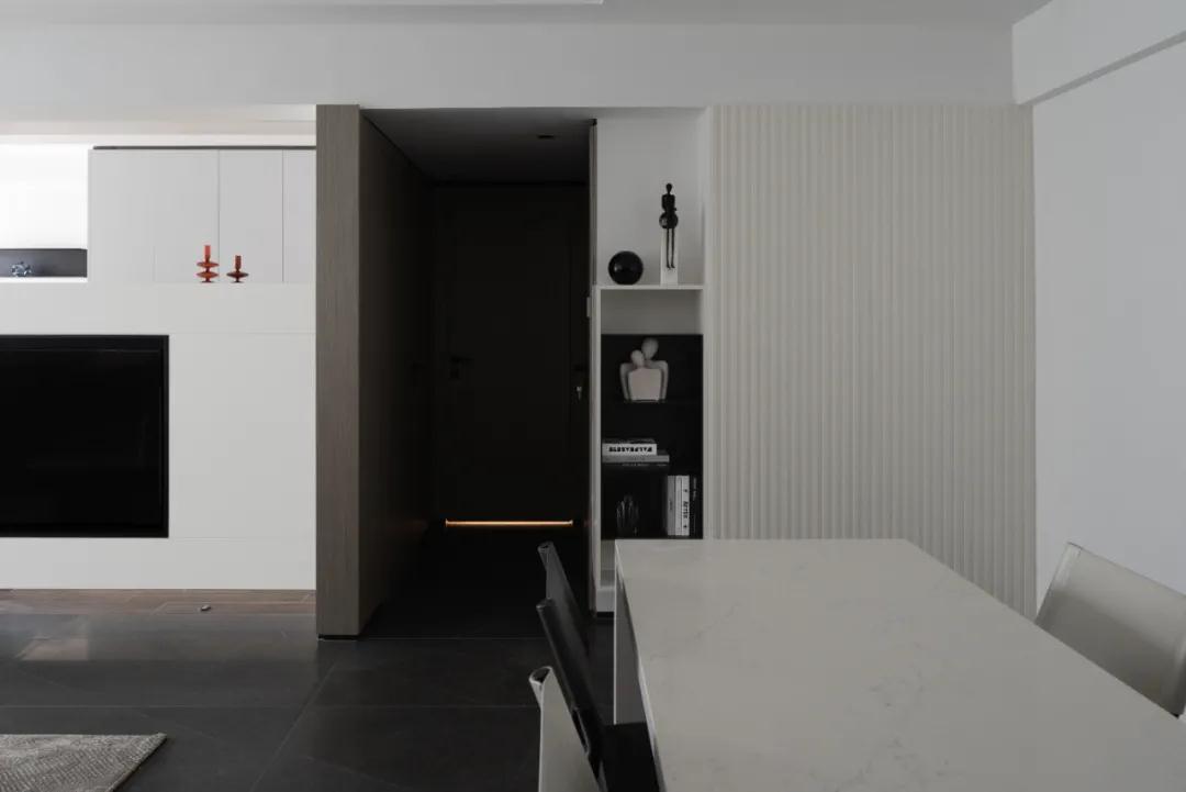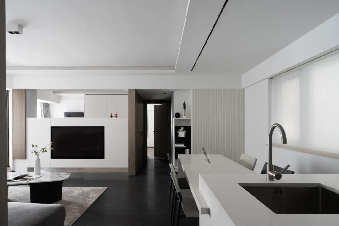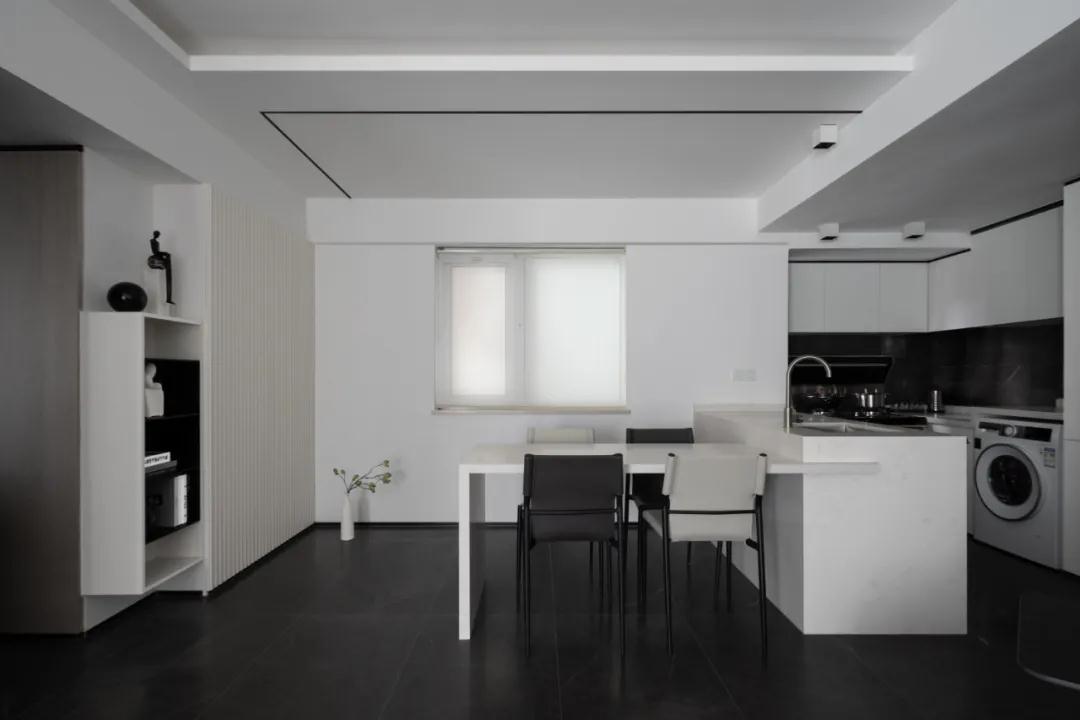 在承載了重要生活場景的餐廚區(qū)域,設(shè)計(jì)師直接把玻璃門和墻體打掉之后,開放式廚房搭配島臺設(shè)計(jì),將整個餐廚空間融為一體,顯得通透、明亮。通過輕松簡約的造型與黑白灰的色調(diào)來呈現(xiàn)空間里的都市感。