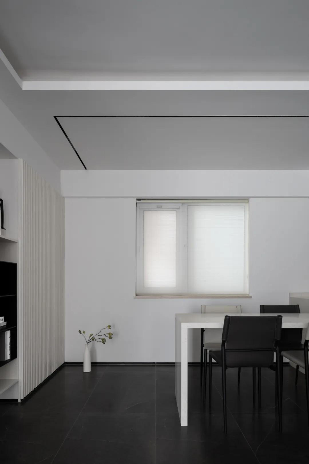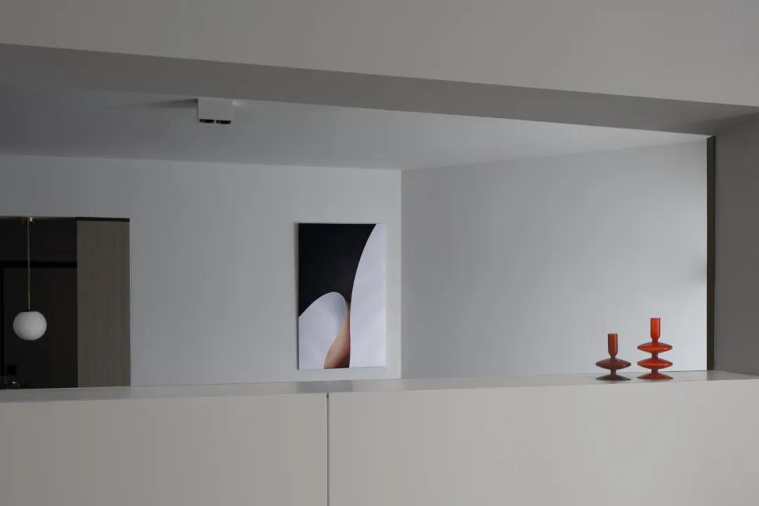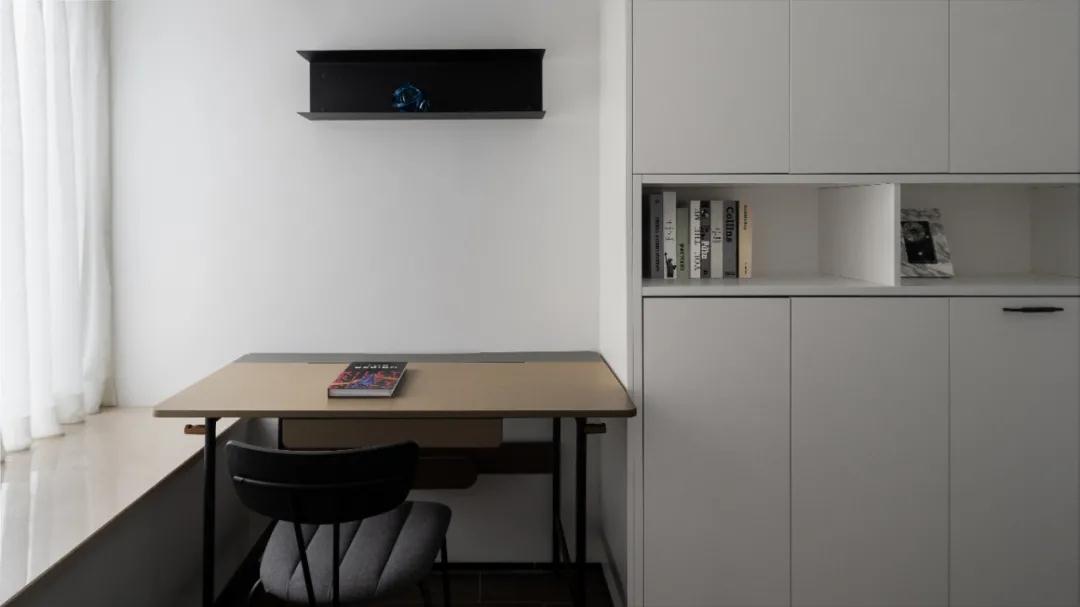 由于房子層高還不到2.6米,客廳與書房之間的墻面留出長條形窗口作為連通,從書房看出去,交錯視線,讓整個空間有深遠(yuǎn)不盡的感覺,虛實(shí)之間趣味倍增。