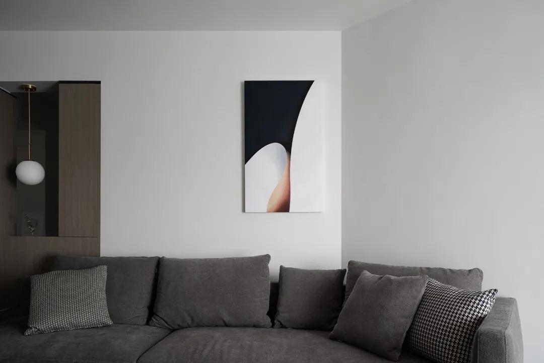 設(shè)計(jì)師選擇拐角沙發(fā)弱化了客廳異型結(jié)構(gòu),完美解決鉆石角所造成的尖銳感,變?nèi)毕轂榱咙c(diǎn)。墻上的抽象畫為整個空間增添了藝術(shù)的氣息,給原本稍顯寡淡色調(diào)加了精彩的一筆。