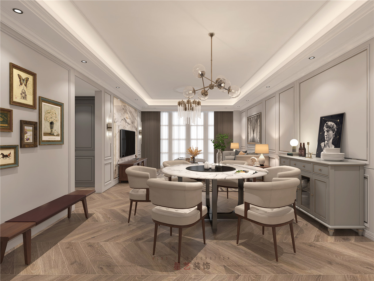 客廳作為主要的待客區,進了門就可以看到主要的休閑區和用餐區,因為整體空間上會比較低矮平和,所以在選材上也會偏向于舒適,柔軟,溫馨的材質組合,可以建立出溫馨的家庭氛圍,兩種的不同精致華麗得吊燈也為客廳和用餐區劃分出區域。
