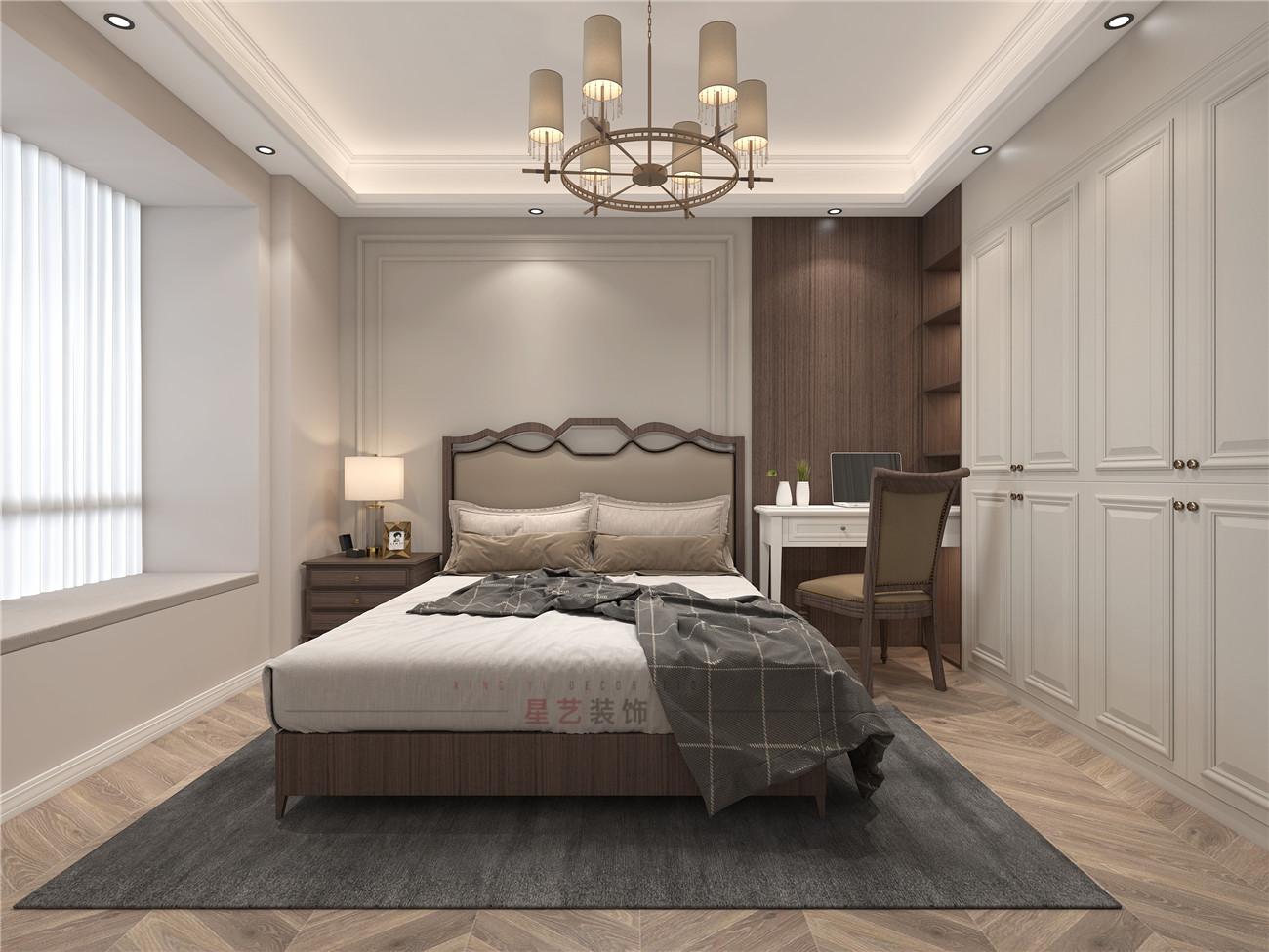 保姆房稍微小一些,但總體來說也是簡約舒適,主要采用藍灰色為主。房間有不同風格的美式吊燈,增加每個空間的奢華感,精致感,讓每個家庭成員都能在這樣溫暖舒適的環境中找到家的歸屬感。
