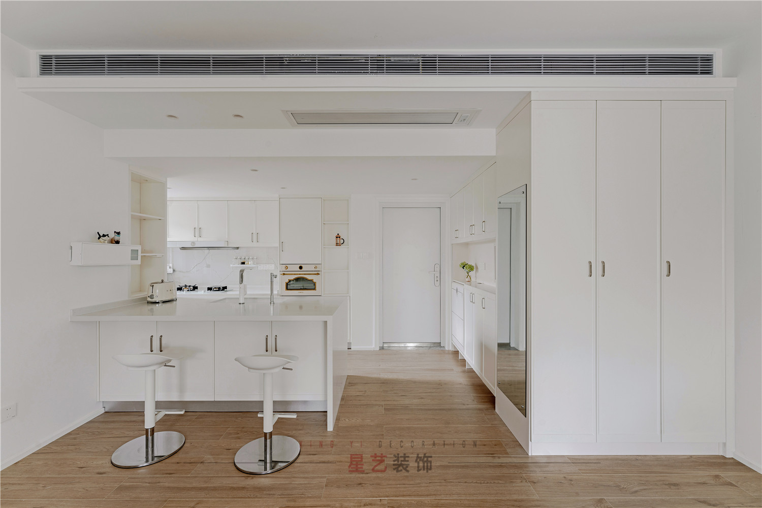 玄關雖然占地面積小,卻是每天的必經之地,超大的容量的儲物柜具有強大的功能性與實用性,底部留空的設計方便打掃又能放日常更換的鞋子,干凈整潔。