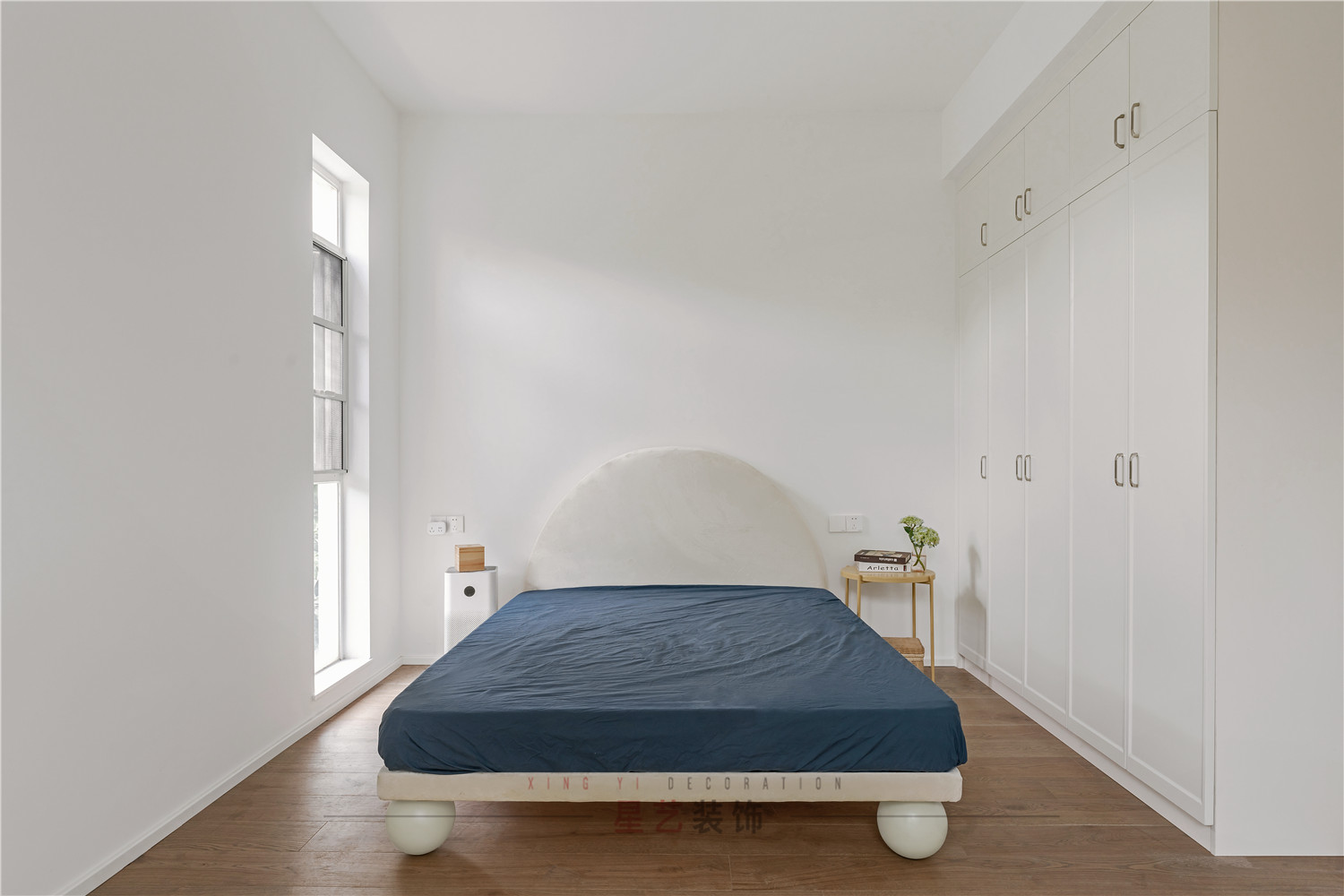 臥室在床頭的位置設計了小面積的落地窗,打破整體白色帶來的空曠感,增加層次關系。半圓形靠背搭配藍色床墊,仿佛置身于海上明月的光景中,給人帶來無限遐想