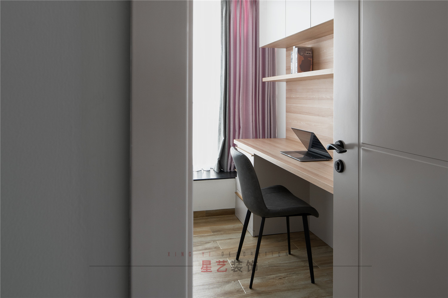 由于工作原因,業主對房間內的最大需求就是大的書桌,在格局上稍微做了調整。原木書桌會更加敞亮柔和,有層次感的色彩也能減少工作或者閱讀的疲勞感。體驗休憩于家的那份寧靜與愜意。