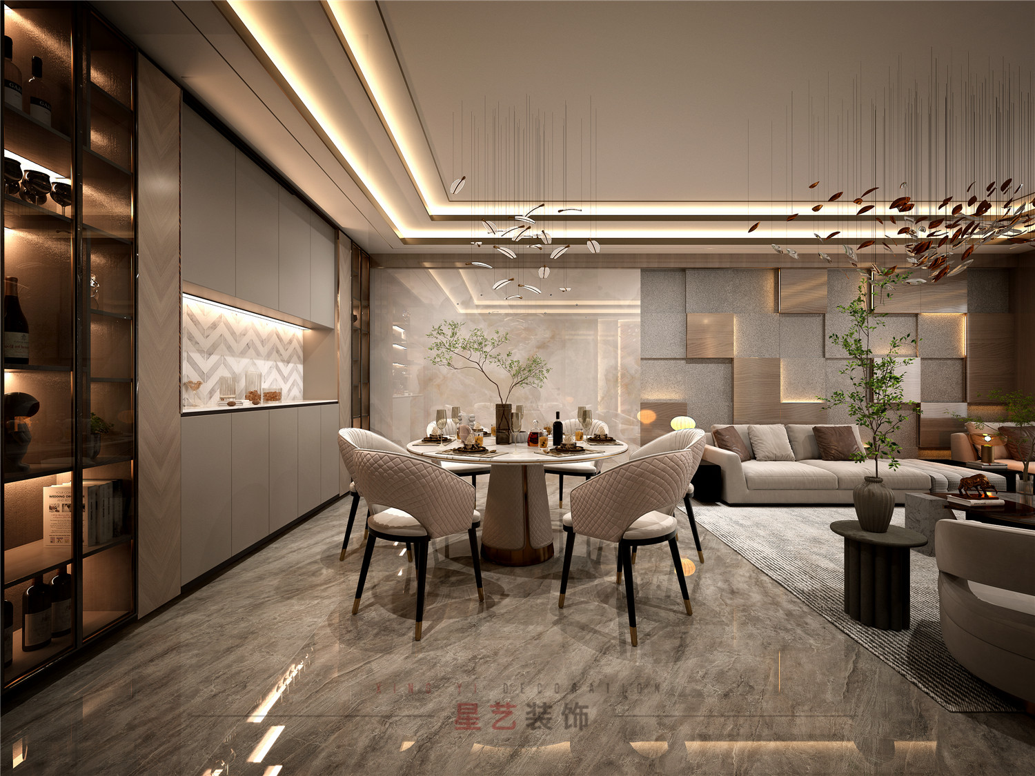 客餐廳以開放式呈現,用不同形式的暖色燈光增添溫馨華麗的氛圍,不規則的客廳背景展現裝飾主義帶來的視覺沖擊。餐廳側面做了一邊酒柜,品味一種極致,未入喉,已醇香四溢。