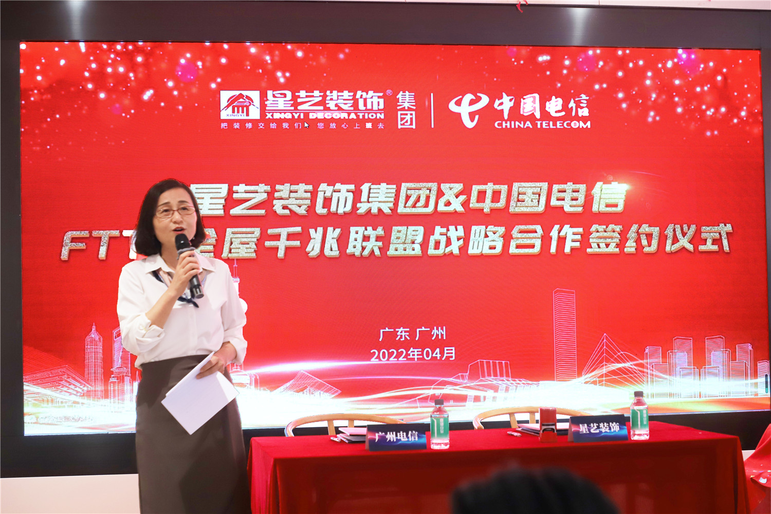 星藝裝飾廣州分公司副總經理劉亦萍對中國電信領導一行到來表示誠摯歡迎和衷心感謝并在致辭中表示,當下家庭組網的現狀還遠遠不能滿足客戶的需求,擁有高寬帶、廣覆蓋,低功耗,強安全、易管理的家庭網絡環境已成為現代家庭的必備之需。