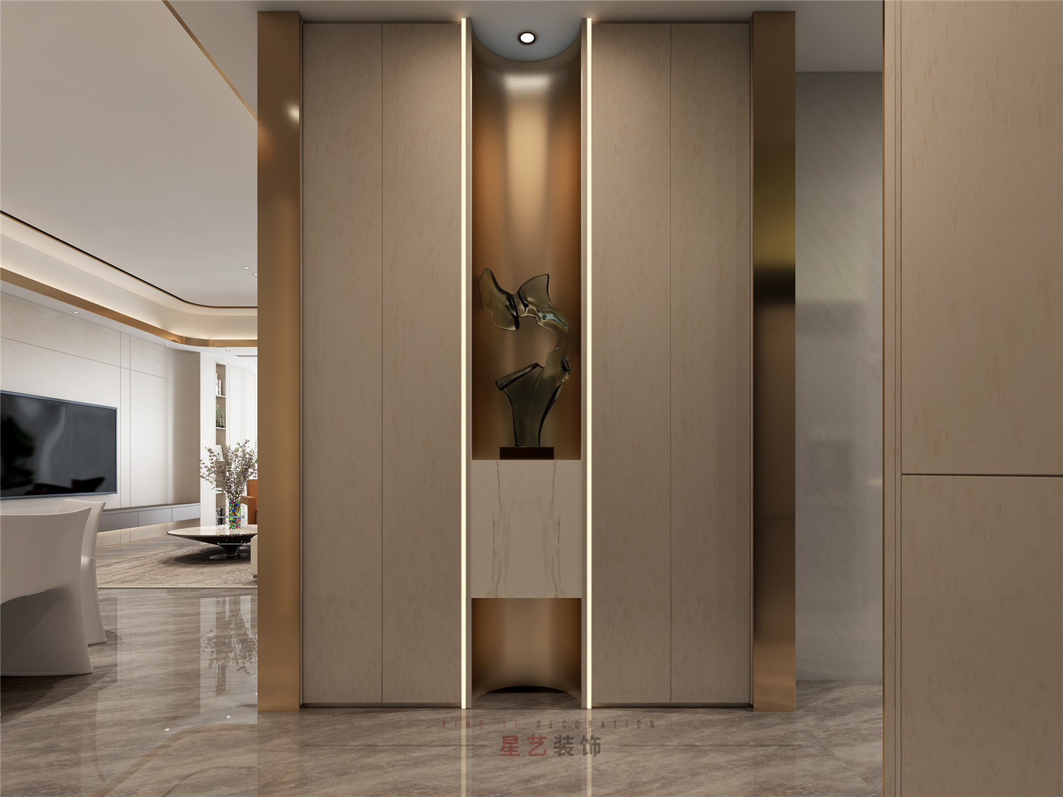 進入玄關,暖白柔和的燈光溫潤細膩